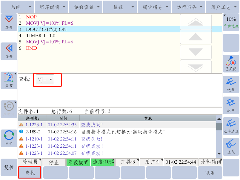 點(diǎn)擊“查找”,彈出查找界?,查找的選項(xiàng)均為各指令的附加項(xiàng)(指令的普通模 式和?級(jí)模式顯示的選項(xiàng)數(shù)量不?樣),選擇需要查找的選項(xiàng),輸?相應(yīng)的數(shù)值后,點(diǎn)擊?菜單欄的“查找”即可在當(dāng)前程序內(nèi)查找符合要求的程序,光標(biāo)或?動(dòng)切換到符合要求的程序?。
