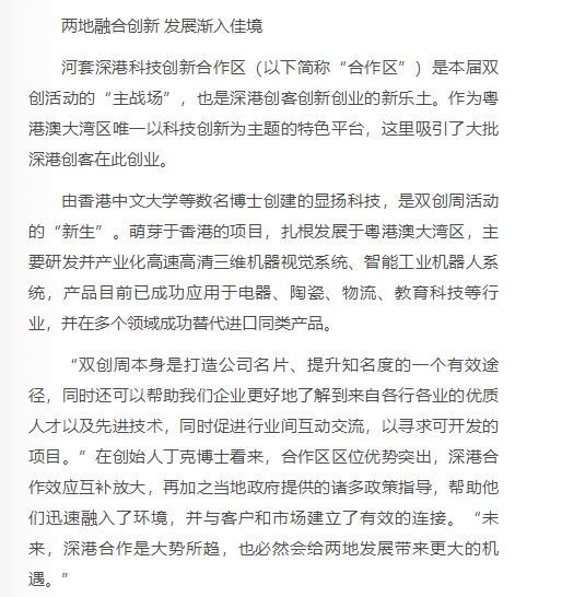 2021年10月20日,《深圳特區(qū)報》報道2021年全國大眾創(chuàng)業(yè)萬眾創(chuàng)新活動周深圳活動暨第七屆深圳國際創(chuàng)客周活動,活動在河套深港科技創(chuàng)新合作區(qū)隆重啟動,歷時一周,舉辦啟動儀式、成果展示、創(chuàng)客論壇、創(chuàng)新競賽、線上招聘會等多類活動,形成市區(qū)聯(lián)動、競相發(fā)展,全面展現(xiàn)深圳良好的雙創(chuàng)環(huán)境以及在實施創(chuàng)新驅(qū)動發(fā)展戰(zhàn)略所取得的階段性成果。顯揚科技作為雙創(chuàng)周活動中的“新生”,創(chuàng)始人丁克博士也受到了《深圳特區(qū)報》的專訪。