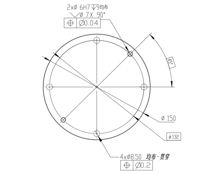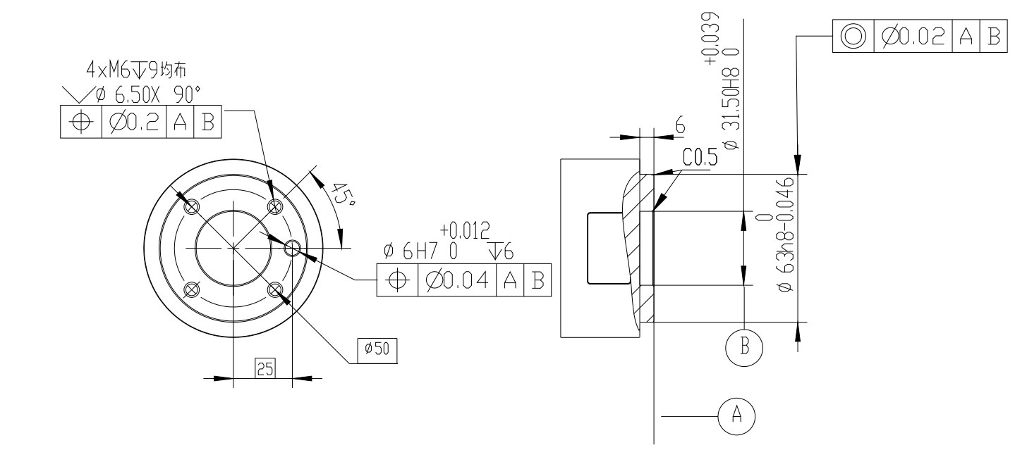 工具法蘭有四個(gè) M6 螺紋孔和?個(gè) Ф6 定位孔,可以?便地將夾具安裝連接到機(jī)器? 末端。?具法蘭機(jī)械尺?如圖1-3所示。