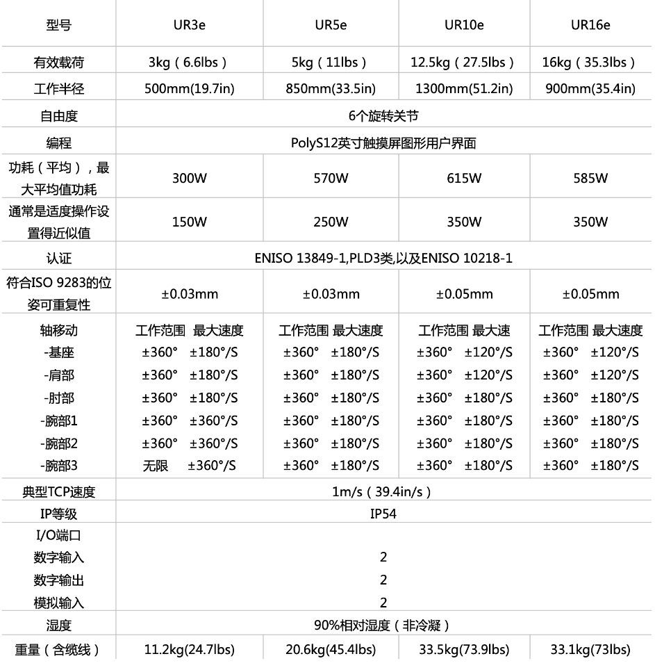 UR協作式機器人產品參數: