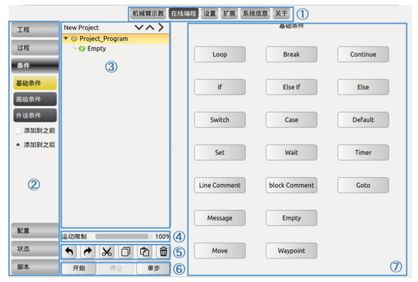 用戶對AUBO機器人的編程主要在在線編程面板里進行,面板主要分為以下幾個部分:
