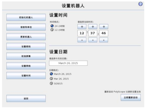 設置系統(tǒng)的時間和日期,并配置時鐘的顯示格式。時鐘顯示在運行程序和機器人編程屏幕頂部。輕觸時鐘將立即顯示日期。必須重新啟動 GUI,所做更改方可生效。
