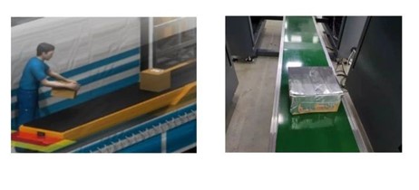 顯揚科技自主研發的高速高清三維機器視覺設備HY-M5對傳送帶上的不規則物體、箱包進行輪廓掃描,速度最快可達10Hz。