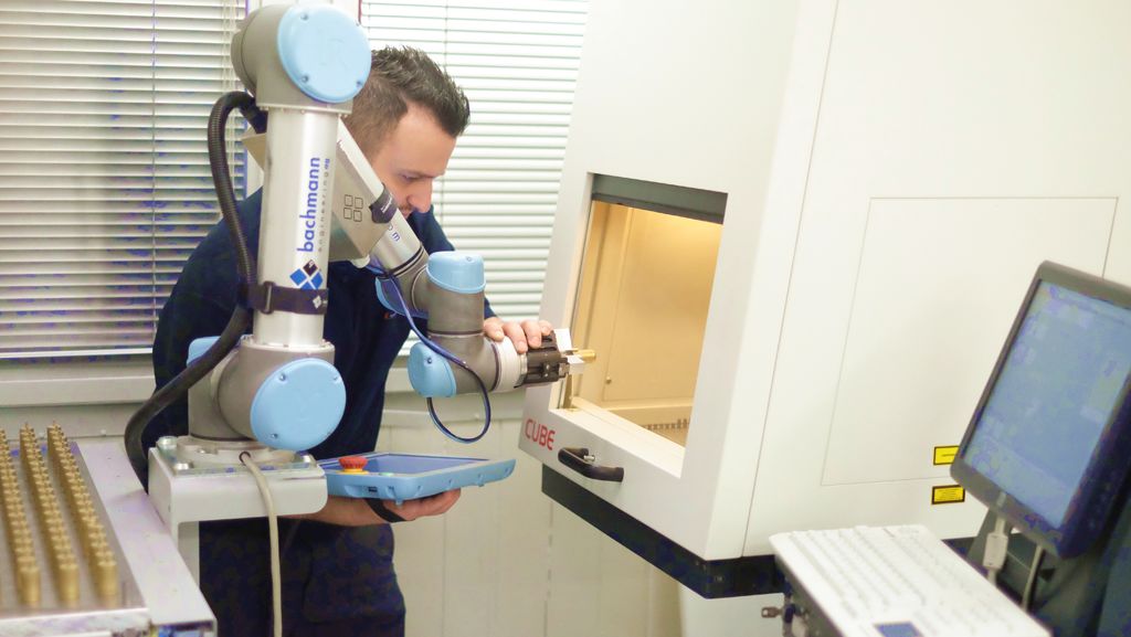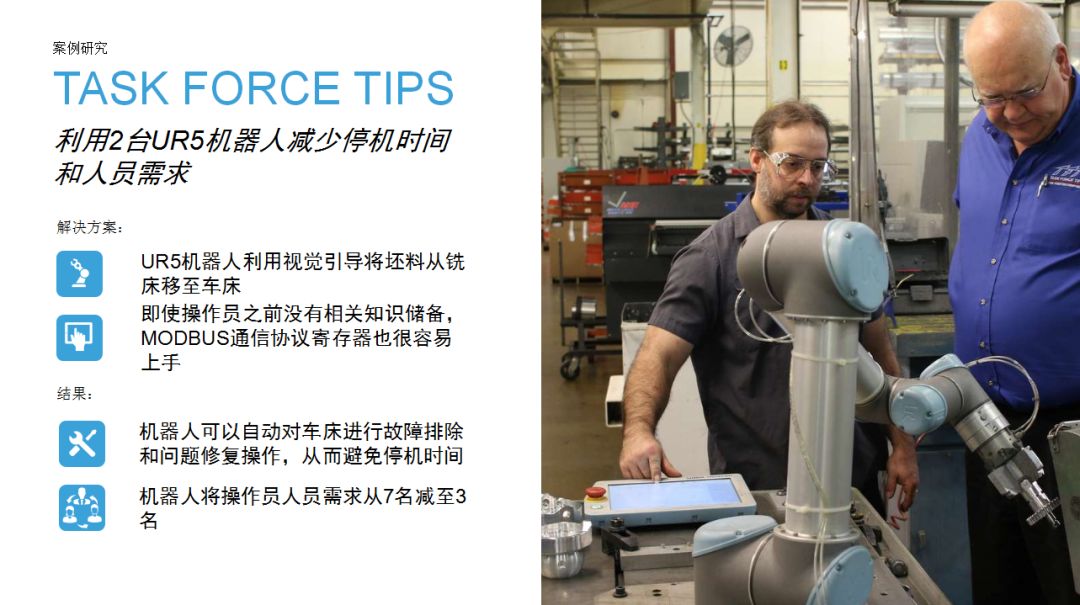 在提高生產(chǎn)節(jié)拍的同時,協(xié)作機器人在機床管理工位的應用提升了生產(chǎn)安全性——減少人工操作員在工作中因靠近數(shù)控機床等重型機械而受傷的風險。此外,當UR機械臂接觸到工作人員時,UR的專利技術會限制接觸時產(chǎn)生的力量。還可以通過對UR機器人進行編程,使其在有人進入機器人的工作區(qū)域時在減速模式下運行,人員離開后恢復全速運行。
