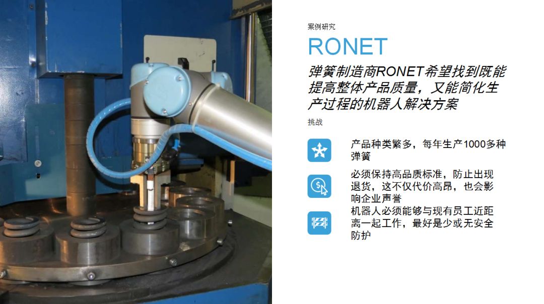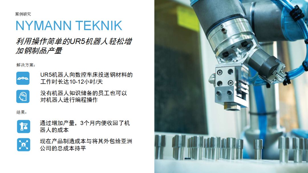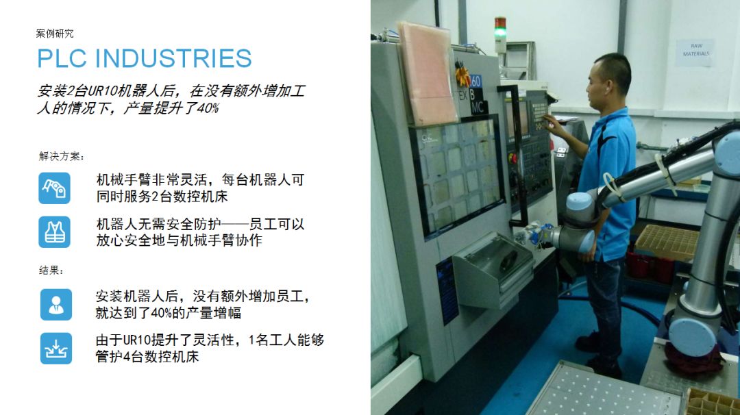 3、優(yōu)傲機械臂的導入能夠替代原來照管機器人的工人,從這些崗位上轉移出來的人力可以從事有更高附加值的工作。同時,也降低了人手操作機床的危險系數(shù)。