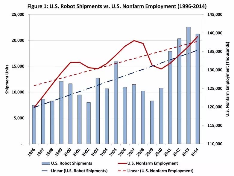 美國推進自動化協會發表的一份名為《機器人推動了美國生產率和就業增長的新浪潮》的報告討論了這一問題。摘自該報告的以下圖表顯示了美國20年來就業增長與機器人出貨記錄的關系,表明機器人的使用與就業的總體改善齊頭并進。