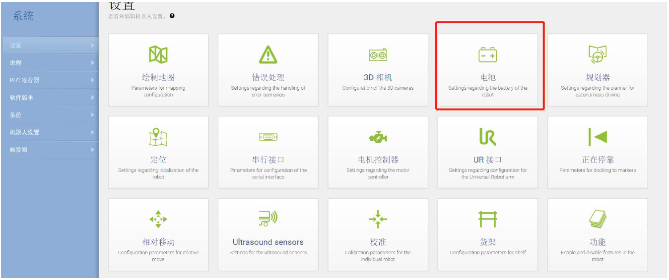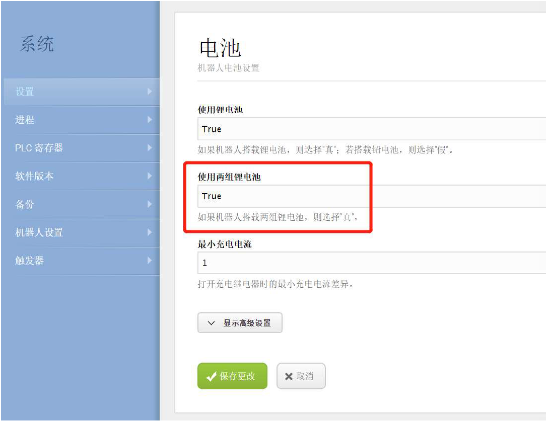 在MiR機(jī)器人操作界面“系統(tǒng)>設(shè)置>電池”選項內(nèi)設(shè)置使用兩組鋰電池為:true, 并保存更改。