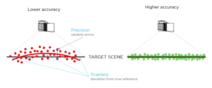 如圖所示,準確性應該同時滿足精度和真實性因素。需要強調的是,準確性將根據工作距離、環境溫度、環境光和相機設置等條件而有所變化。