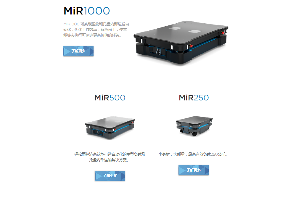 自成立以來,MiR堅持每年推出一款新機器人,竭力滿足客戶需求。現有AMR的有效負載從100公斤到1000公斤不等,可優化從運送小零件到自動搬運重物和托盤的所有工作流程。