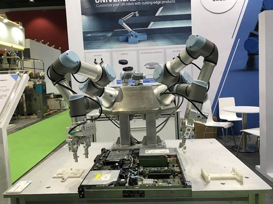 在該應(yīng)用中使用UR雙臂機(jī)器人,其中一個手臂安裝服務(wù)器CPU,同時另外一個手臂安裝風(fēng)扇。完成后,雙臂協(xié)同裝配內(nèi)存條。UR雙臂機(jī)器人的兩個手臂,既可以單獨(dú)運(yùn)行,也可以協(xié)同工作。