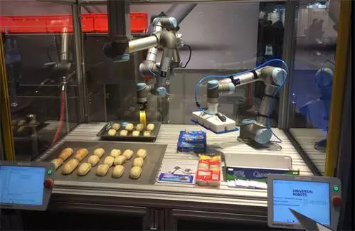 優(yōu)傲機(jī)器人公司出品的人機(jī)協(xié)作機(jī)器人在食品加工環(huán)境中已證明具備用武之地。食品加工對(duì)其環(huán)境的溫濕度條件和衛(wèi)生狀況有特定的要求。優(yōu)傲機(jī)器人可以在環(huán)境溫度0°C到50°C之間、含氧量相對(duì)較低的環(huán)境下正常工作工作,而這對(duì)于人工來說則必須配備特殊的設(shè)備。