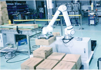 加之協作機器人的安全性,無需安裝安全圍欄即可與人共享操作空間,因此工廠無需重新部署產線,也不必預留安全距離, 大大降低了機器人應用的限制。由于托板和傳輸線之前有較大距離,因此在對最下兩層貨物進行碼垛的時候,通過升降柱的移動幫助機器人夠到較位置的紙箱,機器人通過真空吸盤進行 上下料。